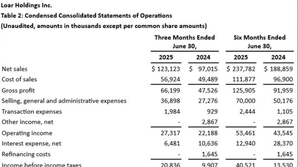 Loar gab für das Quartal einen Nettoumsatz von 123,1 Millionen $ bekannt, was einem Plus von 26,1 Millionen $ bzw. 26,9 % gegenüber demselben Quartal des Vorjahres entspricht. Organisch betrachtet(1) stieg der Nettoumsatz um 11,3 % bzw. 11,0 Millionen $ auf 108 Millionen $.
