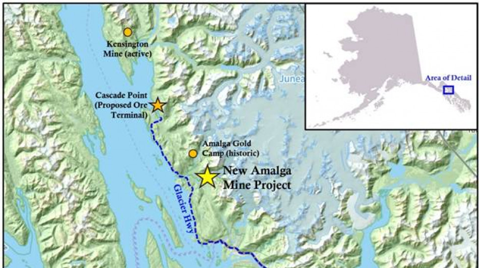 Eine 100-prozentige Beteiligung am Goldprojekt New Amalga, das sich in der Nähe der Infrastruktur nur 25 km nördlich von Juneau (Alaska) und 6 km von einer ganzjährig befahrbaren asphaltierten Straße entfernt befindet (Abb. 2)