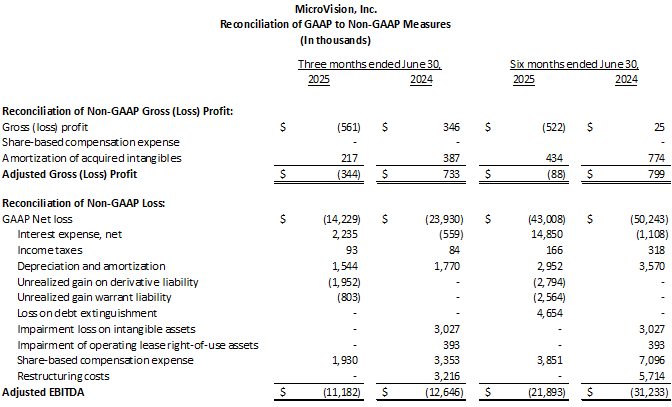 To supplement MicroVision's condensed financial statements presented in accordance with GAAP, the Company presents investors with the non-GAAP financial measures "adjusted EBITDA" and "adjusted Gross Profit." Adjusted EBITDA consists of GAAP net income (loss) excluding the impact of the following: interest income and interest expense; income tax expense; depreciation and amortization; non-cash gains and losses; share-based compensation; and restructuring costs. Adjusted Gross Profit is calculated as GAAP gross profit before share-based compensation expense and the amortization of acquired intangibles included in cost of revenue.