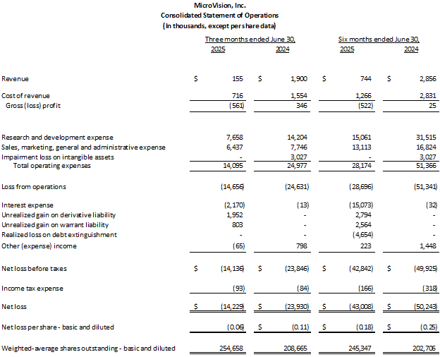 REDMOND, WASHINGTON / ACCESS Newswire / August 7, 2025 / MicroVision, Inc. (NASDAQ:MVIS), a technology pioneer delivering advanced perception solutions in autonomy and mobility, today announced its second quarter 2025 results.