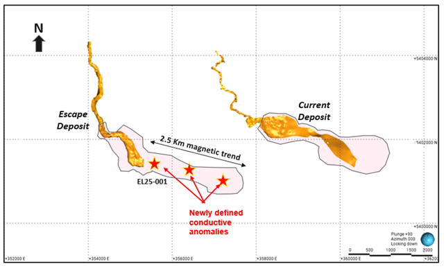 In August, the Company drill-tested the first of several geophysical targets in the modelled down-plunge extension of the Escape Deposit (see July 22, 2025, News Release). These targets were selected within a 2.5 km-long magnetic anomaly that locally coincides with recently defined conductivity anomalies (Figure 1).