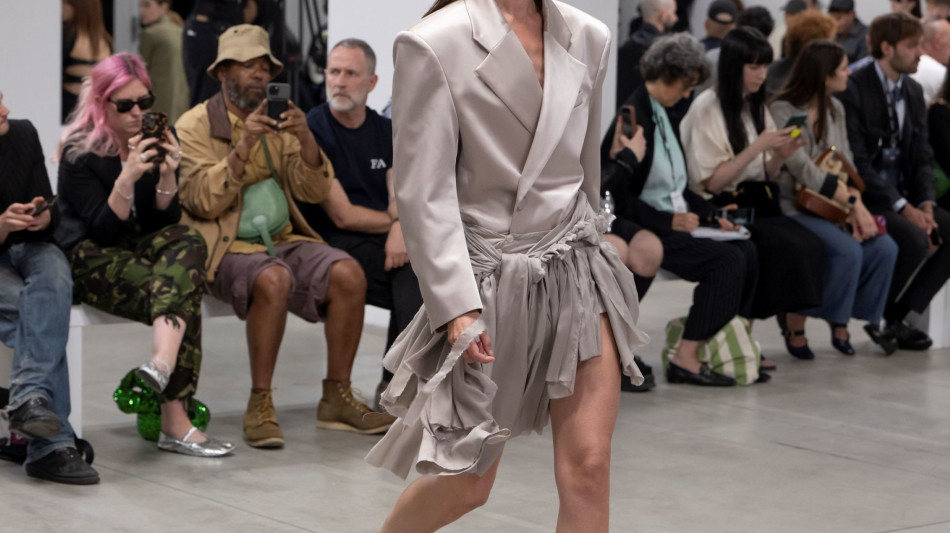 Portano pumps a punta in pelle nera e stivali con il tacco i ragazzi con la cresta vestiti da JordanLuca, il marchio disegnato da Jordan Bowen e Luca Marchetto. Se gli uomini indossano ciclisti e bomber dalle spalle squadrate, giacche in tweed giapponese con spalle imbottite, top con zip e scollo all'americana sotto ai capispalla dai colli ingigantiti, per lei gli abiti da ballerina rivisti e corretti in versione dark e sfrangiata si alternano ad ali da angelo e trasparenze, in una collezione che danza tra i contrasti, tra abiti plastificati e tubini floreali con strappi realizzati a mano e ripiegati.